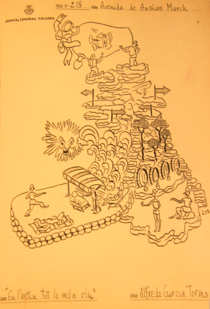 AÑO 1973FM DOLORES TEODORO CASANOVALEMA FALLA GRANDE“EN L’ESTIU TOT LO MON VIU”ARTISTA: ALFREDO GARCÍA TORMO